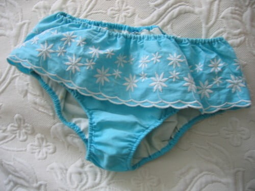 Åh. Denna ljuvliga bikini hittade jag hos mormor. Min moster bar den under sent 50-tal typ. Den sitter som en smäck, och volangen på nederdelen gör att det ser ut som man bär en liten kjol! Bikinin har dock väldigt, väldigt spetsiga kupor. Jag tycker att det är coolt, men vet faktiskt inte om jag vågar. Kanske jag köper en annan överdel till?!