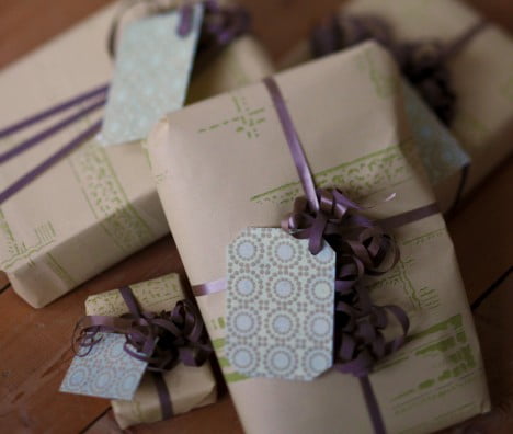 Jag använde en gammal tapet för att slå in paketen och gjorde etiketter av scrapbookpapper.  Nu ska jag bara köpa en lackstång och göra fina sigill. Lackstång luktar ljuvligt.