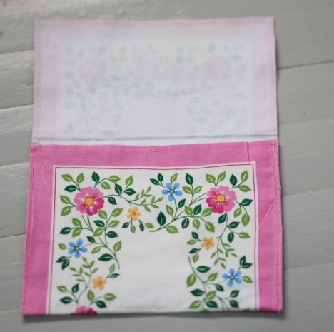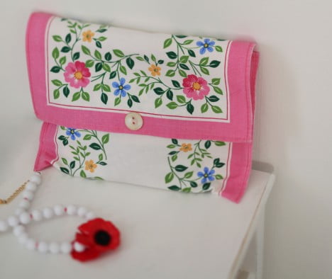 Små dukar finns det gott om på loppis. En liten rektangulär duk blir en fin kuvertväska som passar bra i ungarnas utklädningslåda – men såklart också som vanlig väska. Vik ihop tyget på längden som när man viker ett kuvert. Sy ihop kortsidorna med raksöm så att det blir en väska. Vill man ha mer stadga i väskan kan man stryka fast vliseline på insidan av tyget innan man syr ihop väskan. (Vliseline är ett fibertyg som säljs i tygaffärer – fråga om du inte hittar)
