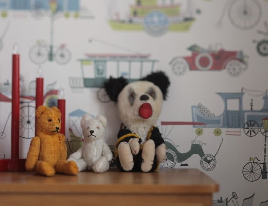 Gamla fina nallar från när mamma var liten matchar fint till tapeten. Jag gillar att den är barnslig men lite dovare i färgerna. Det måste inte vara skrikiga färger bara för att det är ett barnrum (även om jag gillar färgstarkt också!)
