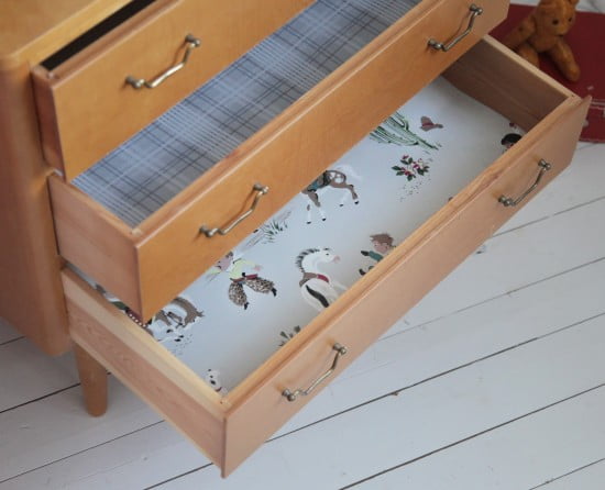 Så fint att ”tapetsera” byrålådor! Blir så mycket roligare att öppna då:)