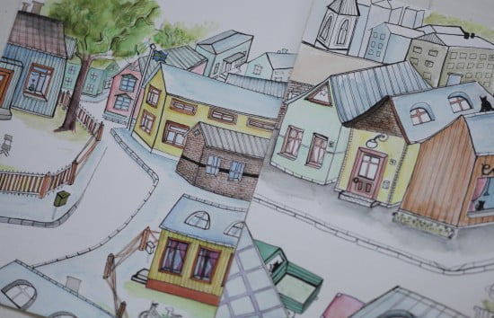 Men åååh så fint! Den här typen av bilder får mig alltid att känna mig som när jag var liten. Det är svårt att förklara men det är en så härligt magisk känsla, som om jag skulle kunna stiga in i bilden när som helst och gå runt och kolla bland alla de fina husen. Om du någon gång skulle vilja illustrera en bok skulle nog många vara intresserade 🙂