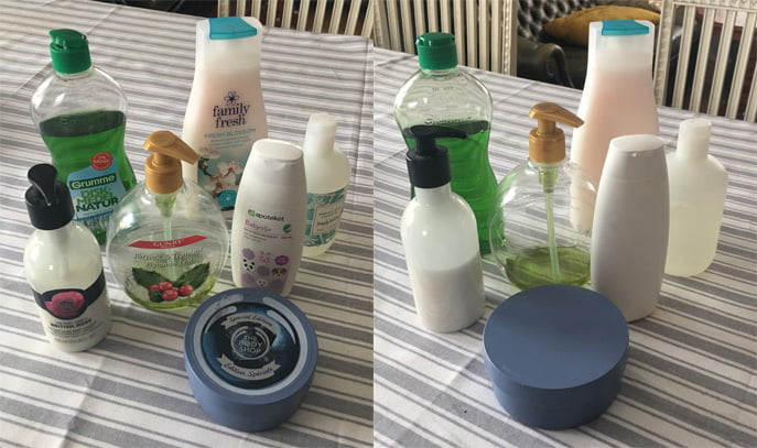 Ritch ratch! Den här veckan hjälper jag Erica att rensa sitt badrum från reklam. Schampoflaskor, tvålburkar och duschkrämer blir av med sina etiketter tills bara den enkla nakna flaskan är kvar. Vi gör det här för att hennes utmattade hjärna ska få bättre vila när hon ligger och badar. Förpackningar utan budskap kräver nämligen ingen uppmärksamhet.