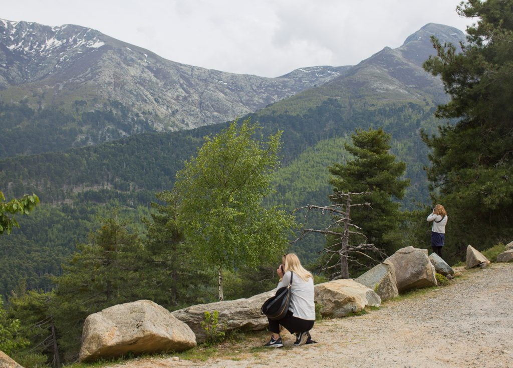 Vi stannade och fotograferade allt fint vi såg.  Ja här ser ni ryggtavlorna på Towe och Sarah som dokumenterar platsen. Så här högt uppe växer det björkar och pinjeträd. På vintern ligger det snö så att man både kan åka längdskidor och utför.