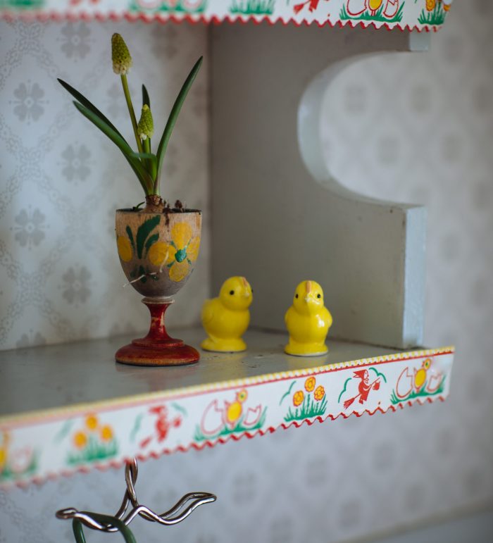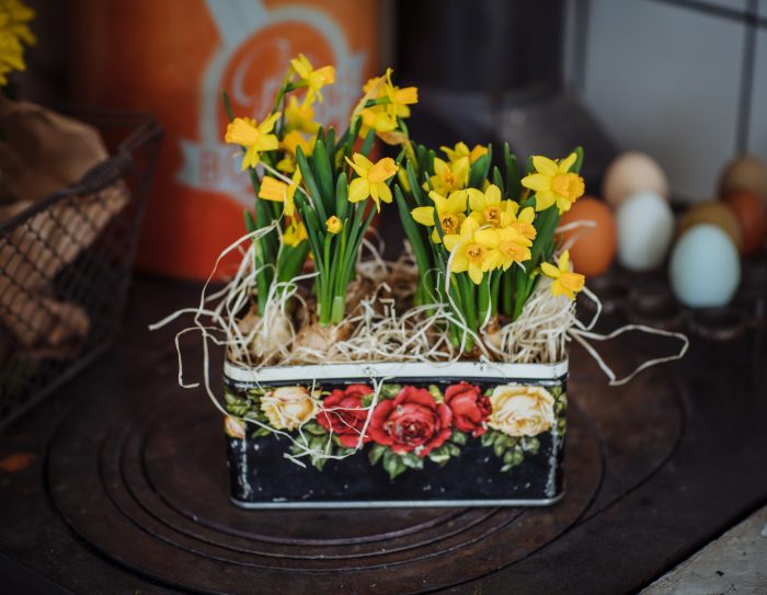 Underbara små påsktazetter med ännu mer bös ovanpå. Ett sådant här arrangemang är en himla fin påskpresent. Köp en vacker vintage plåtburk och fyll med blommor och ge bort. När blommorna blommat över kan burken användas till småkakor, knappar eller bara som dekoration.