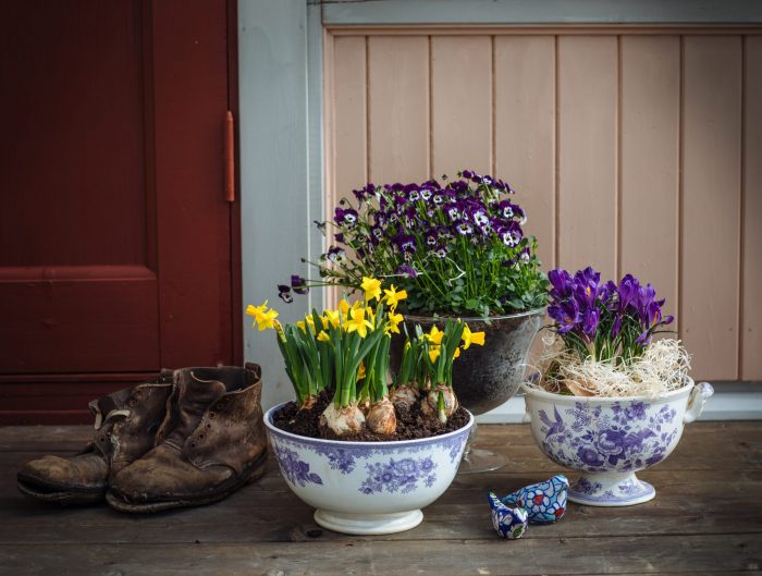 Nu har jag gjort iordning lite påskiga planteringar här hemma. Ute kan man inte göra mycket – senast inatt visade termometern på elva minusgrader – men på verandan klarar sig lökväxterna om man lyfter in dem från bron när det blir kväll.