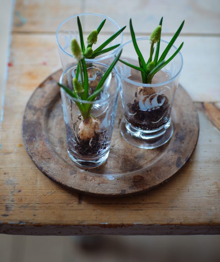 Slutligen plockade jag isär en rugg med pärlhyacinter och ställde ner en och en i små selterglas.