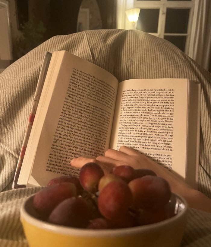 Jag har jobbat nonstop sedan sju imorse och är så trött att ögonen går i kors. En stilla dag har det minst av allt varit. Nu har jag plockat fram lite djupfrysta vindruvor från frysen (som att äta piggelin) och ska ta en riktigt lugn och tidig kväll med min bok.