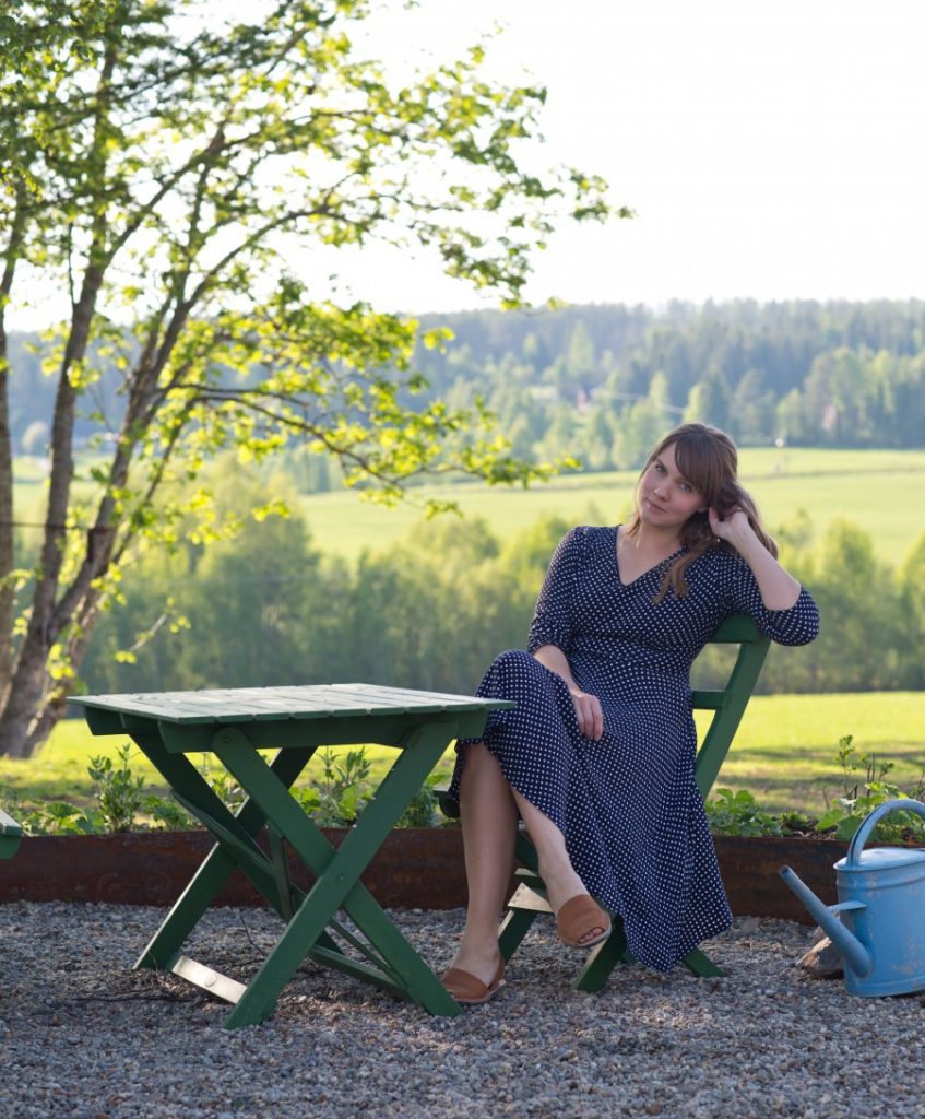 På midsommar bar jag denna Jumperfabrikenklänning som är ett prov och som aldrig kom i produktion men som vi använde som inspiration till den prickiga. Älskade den här färgställningen.