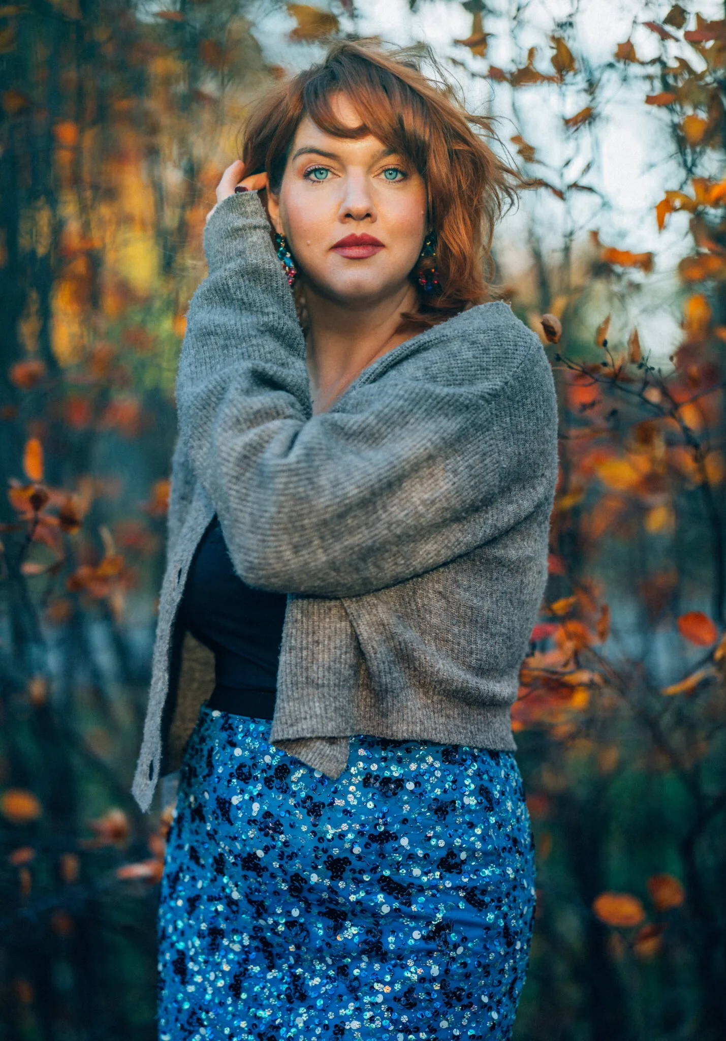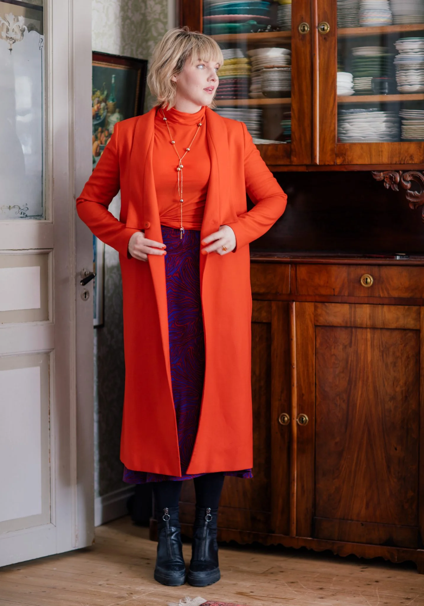 Vinterns sista outfit blir den här med fantastiskt hårsvall och en omlottklänning i trikå av okänt märke.