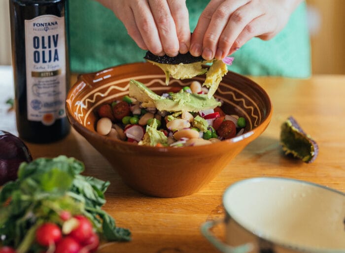- Blanda sojabönor, vita bönor, tomater, rädisor och rödlök. Mosa över avokadon. Slå på en god olivolja, lite ponzu, salt och peppar. Toppa eventuellt med någon färsk krydda.