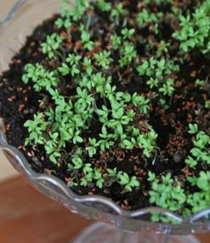 Små odlingsskyltar med kryddors namn som Dill och Basilika.