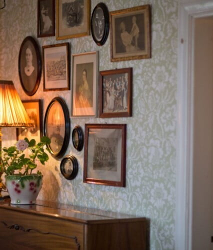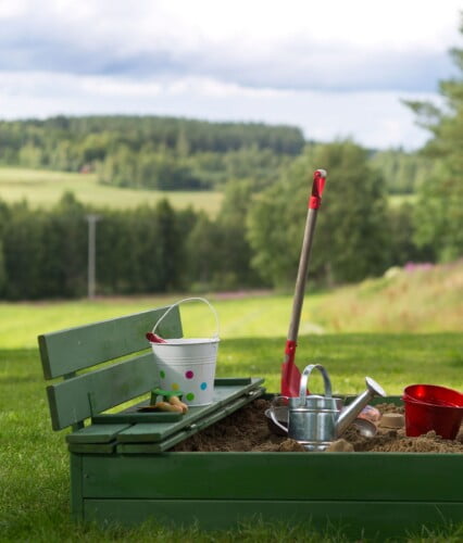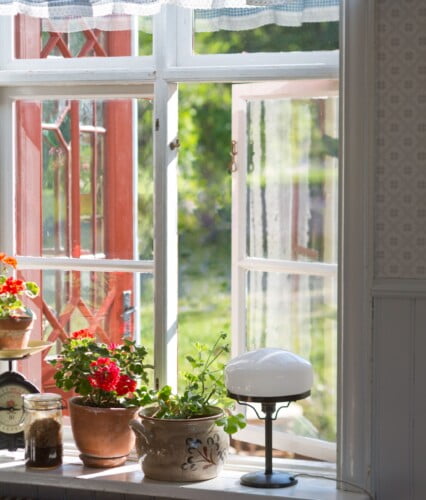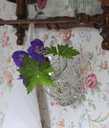 Liten glasburk fylld med socker, burken står på plåtbricka och runt omkring ligger syrenblommor.