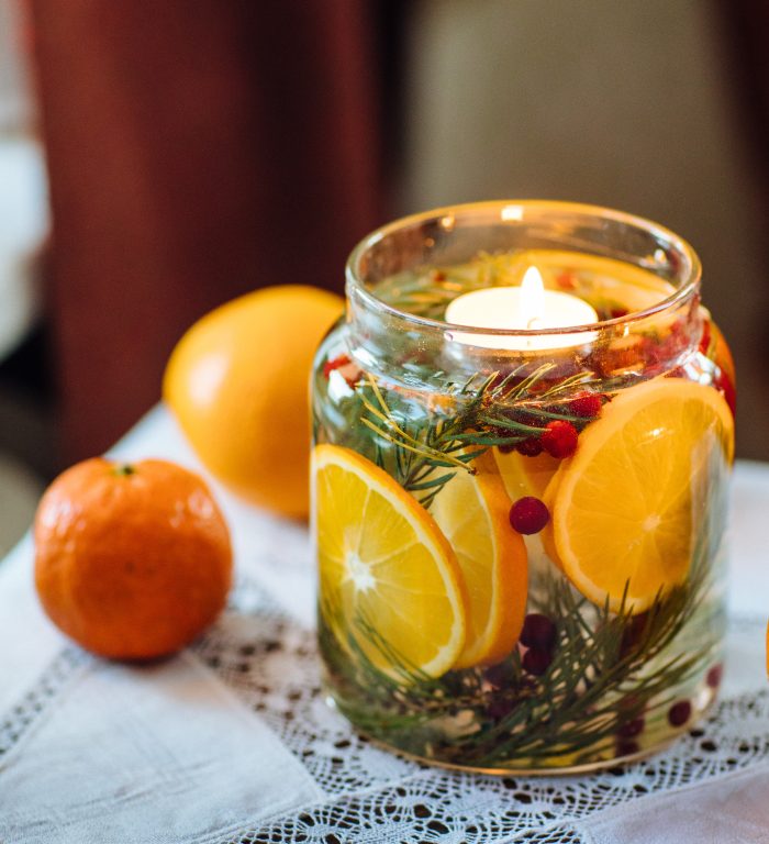 Jag dekorerar hemmet med apelsin, gran, och tranbär. Här har jag lagt allt i en glasskål och pluttat i ett värmeljus som får flyta runt.