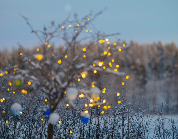 Jag ställer mig vid köksfönstret och ser ut på nakna syrenbuskar och schersmin under gnistrande ljusnät. Äppelträdet ser ut som en eldboll längst ner på gården. Och i portalen in till trädgården, där det om somrarna slingrar humle, hänger nu lysande klot och kulor. Sedd på håll glimrar gården i kapp med snön och liknar faktiskt en iskristall. Det är ljuset som betvingar vintermörkret.