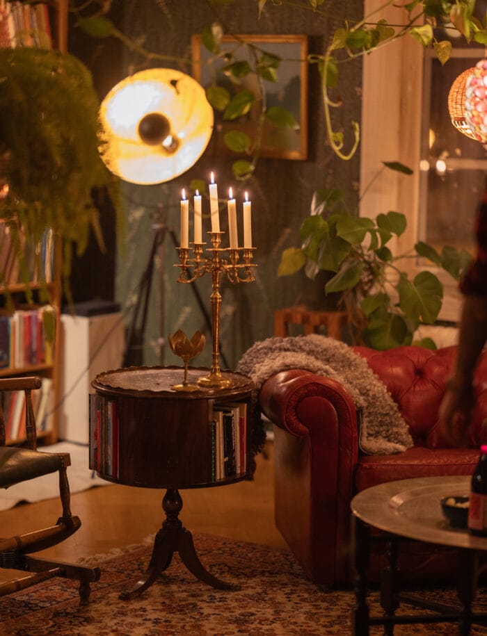 Och ovanför pianot hänger snurrande virvlateller som rör sig i värmen från ljusen.