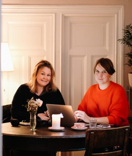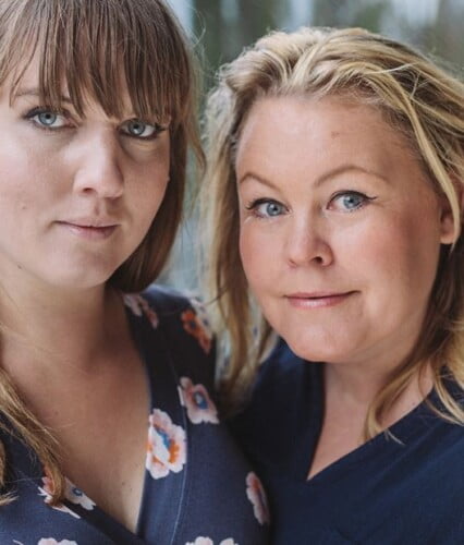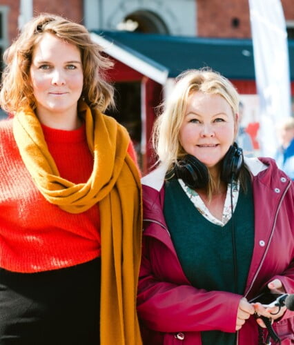 Clara och Erica tittar in i kameran, klädda i sommarkläder i mustiga färger. Ur En Underbar Pod.