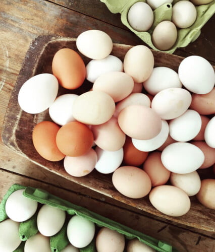 Vanligt äggskal fyllt med choklad istället för vita och gula, i vit skir porslinskopp på färgglad duk.
