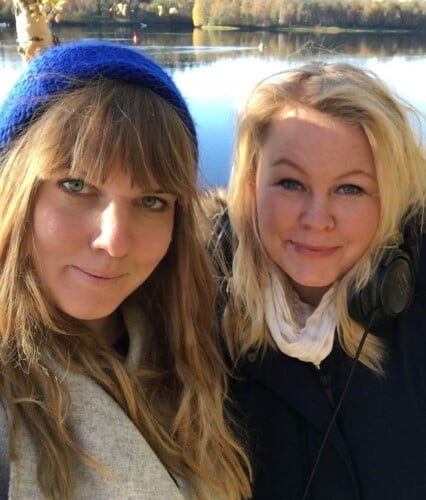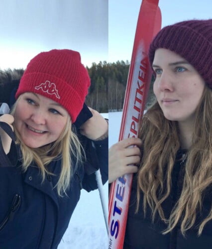 Clara och Erica klädda i vinterkläder framför tallris utomhus, fotat för En Underbar Pod.