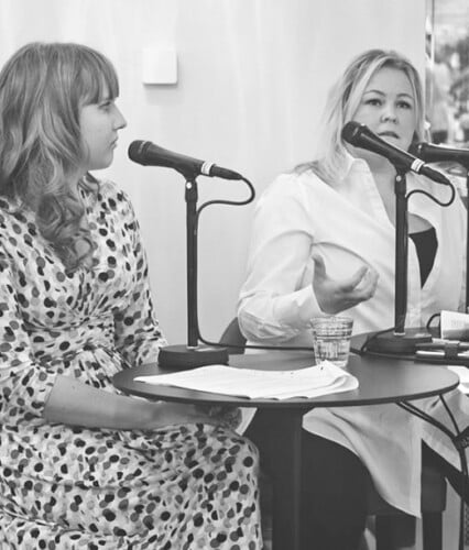 Clara och Erica nedbäddade i en hotellsäng med vita lakan.