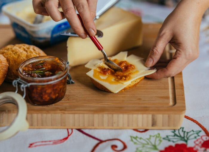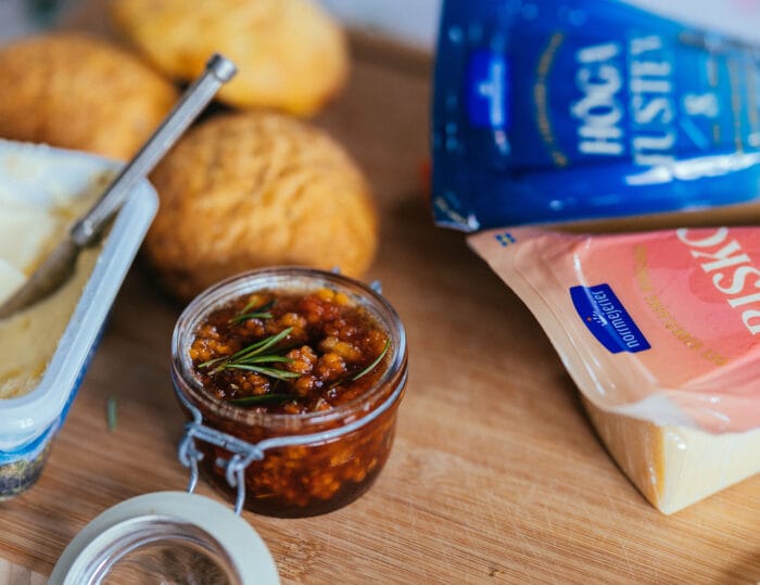 Jag äter gärna osten på en smörgås med lite hemkokt hjortronmarmelad med rosmarin och citron.