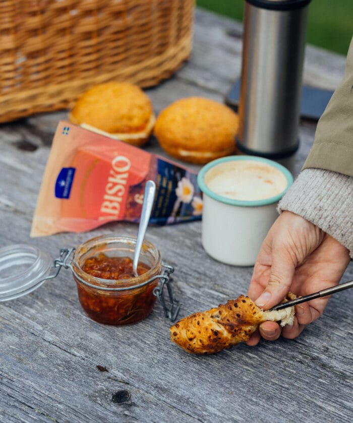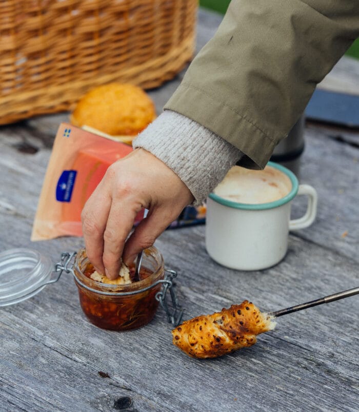 Pinnbröd med smält Abisko, doppad i hjortronmarmelad. Mmmmm…