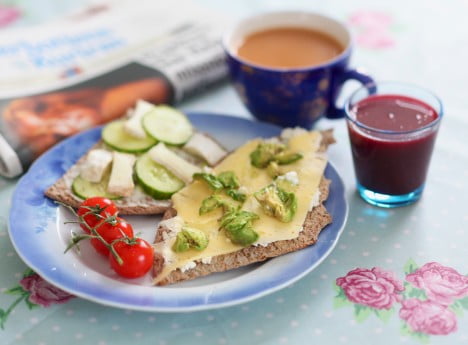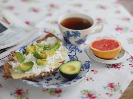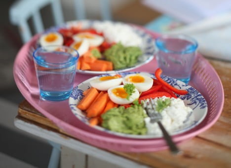 Dagens frukost ska förtäras ute i den solvarma trädgården. Det blir hemmagjord guacamole, keso, morötter, paprika, ägghalvor och så lite färska kryddor på det!