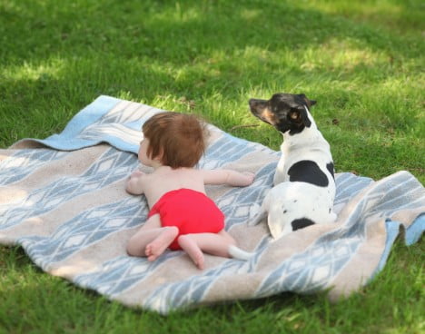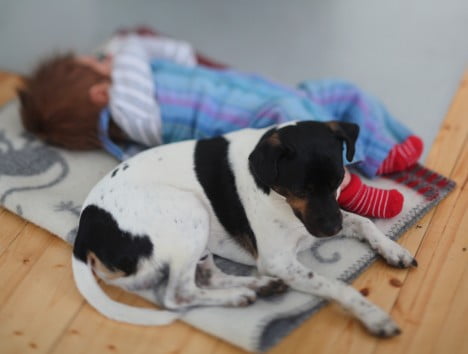 Tomas Andersson Wij i bakgrunden. Bebis, man och hund som sover.