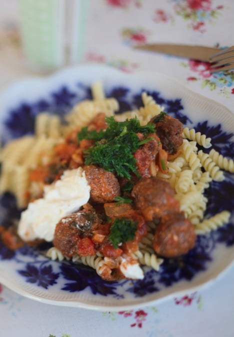 Till middag blev det älgfärsbullar i gräddig tomatsås med lök, vitlök, chili och massor av kruspersilja. (Och innan någon måste kommentera det – det går alldeles utmärkt för min bebis att jag äter kryddstark mat när jag ammar).
