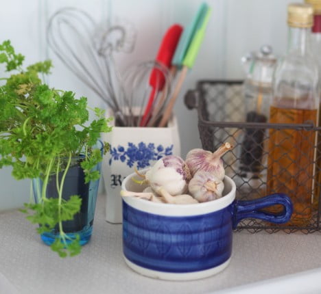 Sådant som är bra att ha i närheten när man lagar mat: Olika oljor, salt och peppar. Massor av vitlök och färska kryddor och så vispar, slickepottar och skedar i en risgrynsburk.