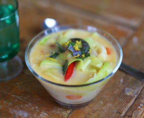 Soppor och grytor är verkligen det bästa sättet att ta vara på matrester och ingredienser som håller på att bli dåliga. Igår blev det en soppa på kokosmjölk, en skruttig röd paprika, några vissna morötter, lök, squash, chili, citronzest, och thailändsk currypasta.