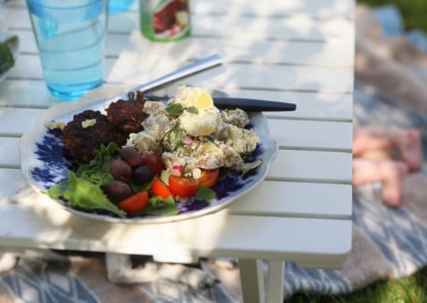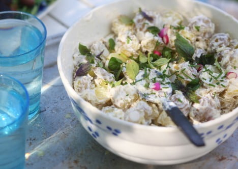 Jag älskar hemmagjord potatissallad och brukar göra den med rädisor och drivor av dill och salladslök. Potatisen får behålla sitt skal, jag bara skrubbar det lite lätt innan kokning. 3/4 delar creme fraische med 1/4 majonnäs blir en perfekt dressing. När jag gör sallad vill jag inte att potatisen ska simma runt i dressingen, som när man köper den. Ett tunt lager dressing på potatisen räcker bra. Och tre vitlöksklyftor och massor av svartpeppar ska det förstås också vara.