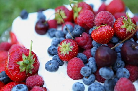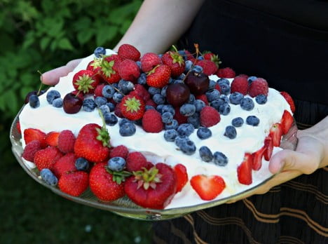 Min bästa sommartårta gör jag på sockerkaksbotten. Delar den och brederr mosade hallon och banan med vispgrädde mellan lagerna. Täcker med grädde och sedan öser jag på mina favoritbär. Jordgubbar, hallon och blåbär. Några körsbär slinker också med om jag har hemma.