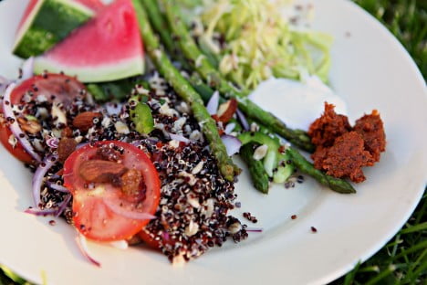 Till det en helt lass sparris med riven parmesanost och så färsk strimlad vitkål med citron och rapsolja på. Det är så fräscht med råkost varma dagar när aptiten är lite dålig.