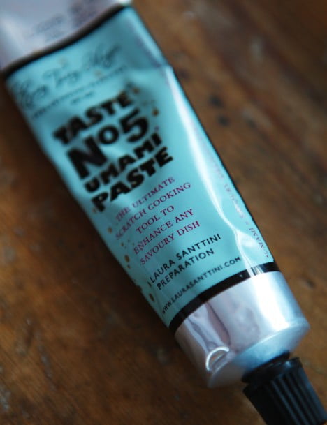 En av mina bästa köksgrejer är denna umamipasta, Taste No 5. Umami som kallas ”den femte smaken” efter sött, surt, salt och beskt skulle man kunna säga är smaken av protein. Umami fungerar som en förstärkare för många andra smaker och höjer de flesta rätter och gör dem mustigare i smaken. I färdigmat och köpta buljonger finns ofta tillsatsen Natriumglutamat, E 621, för att på konstgjord väg pigga upp undermåliga livsmedel. Men med umamipasta behövs inte det. Just den här varianten, Taste no 5 innehåller tomatpure, vitlök, ansjovispaste (ansjovis, salt och solrosolja), svarta oliver, balsamvinäger, Karl-Johansvamp, parmesan, olivolja, vinäger, socker och salt. Umamirika livsmedel som på naturlig väg ger den där riktiga proteinsmaken åt rätter. Hoppas att de gör en variant utan ansjovis snart så att också vegetarianer kan proteinpiffa sin mat.