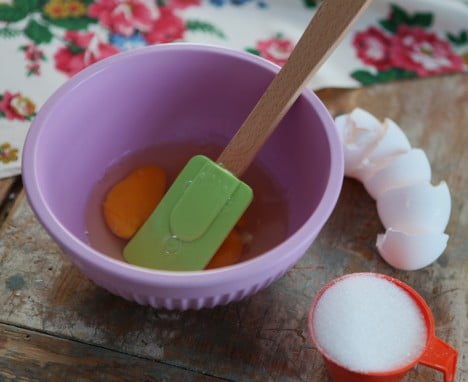 Knäck 3 ägg och blanda med 3 dl socker. Vispa vitt och pösigt.