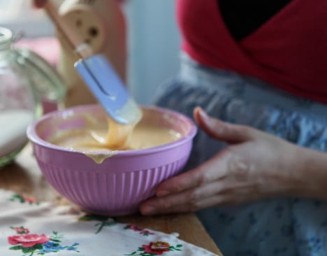 Rör ut tillsammans med 1 1/2 tsk bakpulver.Töm smeten i en smörad och bröad form och slicka rent bunken!