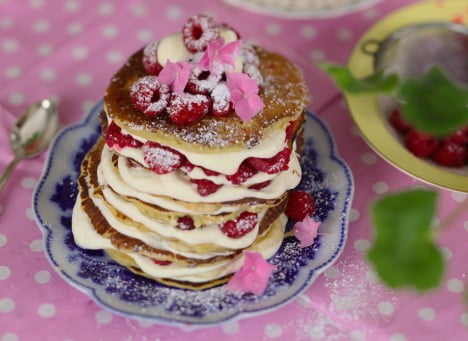 Snart (ok ganska snart i alla fall) är det ju vår och folk fyller år i parti och minut. En av mina favorittårtor att bjuda på är pannkakstårta. Så genialiskt enkelt och galet gott! Jag brukar utgå ifrån ett recept på amerikanska pannkakor och sedan grädda små plättar. Då blir tårtan hög och fin. Sedan fyller jag med bär och grädde och kanske lite glass. Bananslantar är också gott. Här har jag gjort en nätt liten tårta av små plättar, nästan lagom för en person att smacka i sig. Jag tycker nämligen att det är rätt trevligt med en helt egen tårta. Men det är ju jag det!