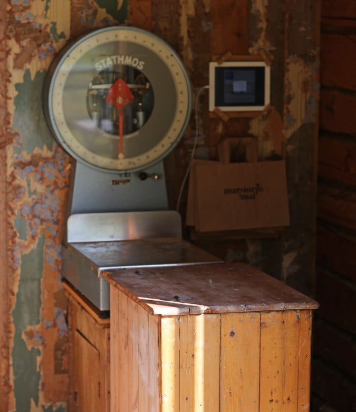 Vår fina gamla våg samt kassarna jag stämplat. Såklart tar vi kort.