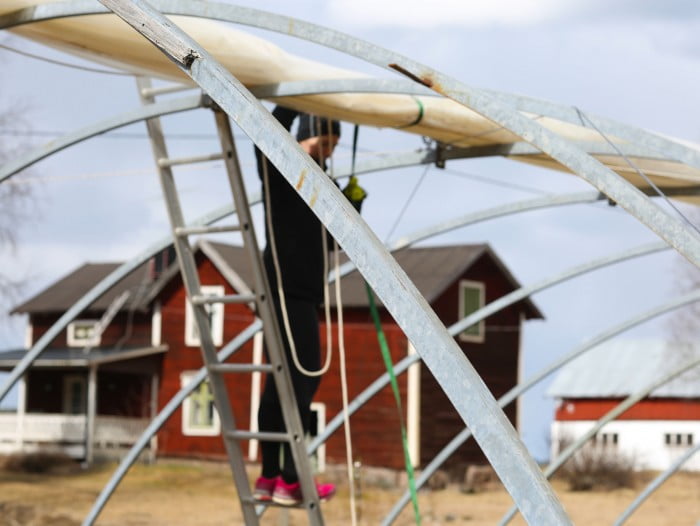 Idag var nämligen dagen så plasten skulle på vårt växthus. En riktig rysare då plasten kan sticka iväg med världens fart ifall det råkar komma en vindpust innan man förankrat den ordentligt. Och är det något man inte vill är det att se cirka 500 kvadratmeter plast segla iväg över skyn. Tack och lov hade vi ett gäng kompisar och grannar som hjälpte oss. Tänk att vi har så många fina människor i vår närhet!