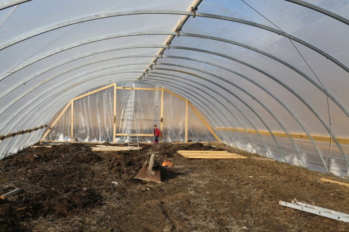Och sedan blev vi som barn på julafton när duken äntligen låg på! Vilket underbart och enormt växthus vi har nu. Helt fantastiskt! Här ska vi odla en massa ekogrönt i sommar. Vi tänker också fästa en hängmatta i taket så att man kan ligga där bland tomaterna och gurkan och filosofera. Vårt odlande ska inte bara handla om hårt arbete och om att ställa mat på bordet – utan också om njutning!