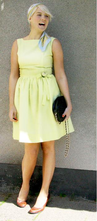 Den här citrongula vintageblåsan fick jag gräva långt bak i arkivet för att hitta en bild på. Närmare bestämt ända till 2008. Det roliga är att jag fortfarande har kvar och använder både väska, sjal och skor på bilden. Och klänning finns också kvar även om jag gett upp tanken på att någonsin komma i den igen. Sparar den för mina barnbarn!