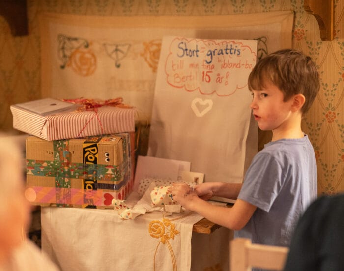 Presentbordet och nyfiken lillebror som letade efter en present till honom. Och det fanns en såklart.