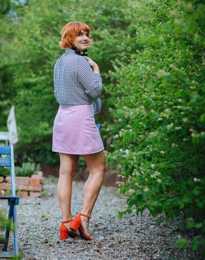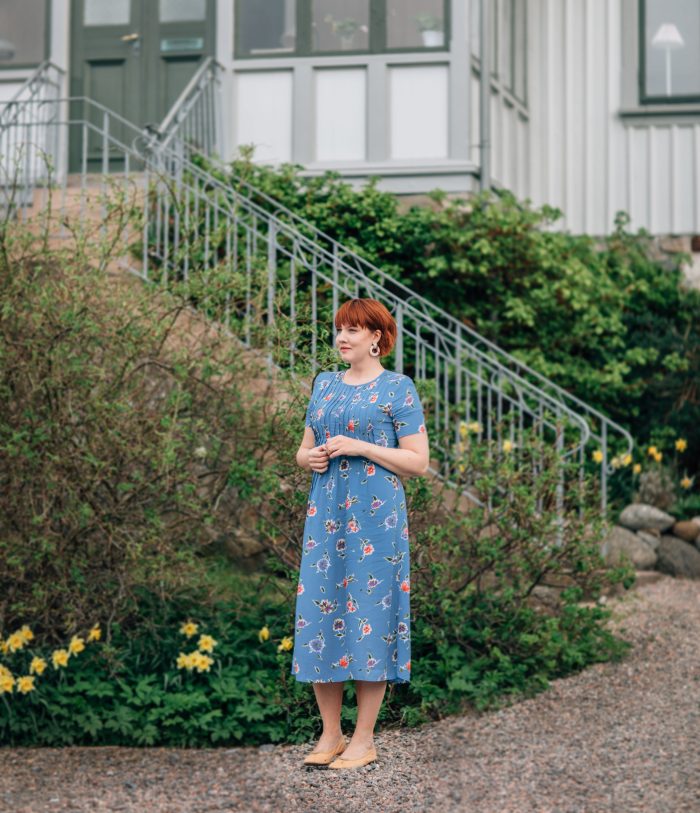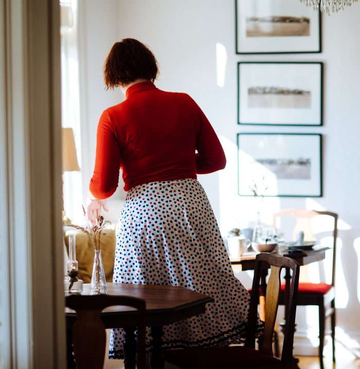 Anna i blus sydd av duk från Alma Tegström plus någon slags gammal byxkjol från Zara tror jag.
