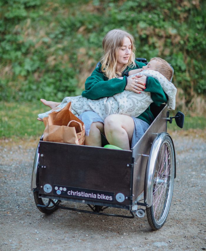 Jakob hade lyckats laga bromsen till lådcykeln, så vi kunde hoja till badet allihop!