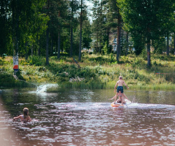 Fler turer för att bada, med diverse olika kompisar till barnen i släptåg.