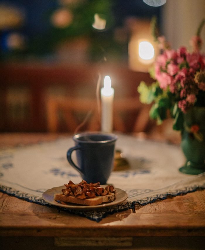 Min frukost: kaffe och toast med smörstekta kantareller.